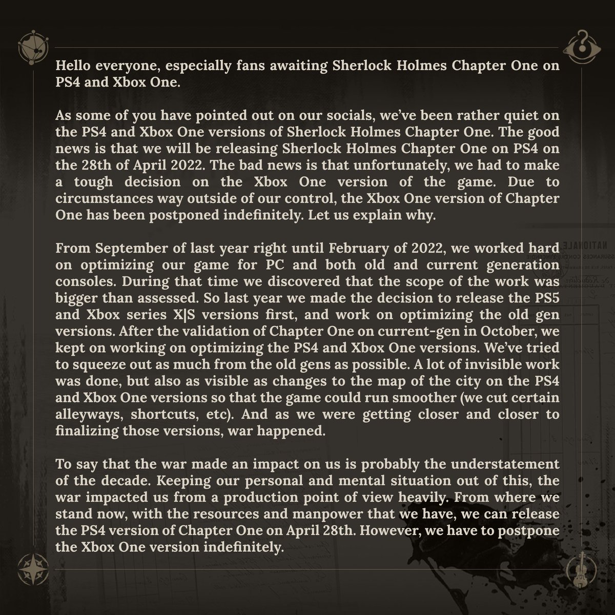Dbamy o Twoją prywatność. Sherlock Holmes Chapter One will now release on Xbox One and PlayStation 4 in Q1 2022 developer Frogwares has. Sherlock Holmes Chapter One is due to launch on Xbox Series XS PlayStation 5 and PC this autumn followed by Xbox One and PlayStation 4 later in the year.